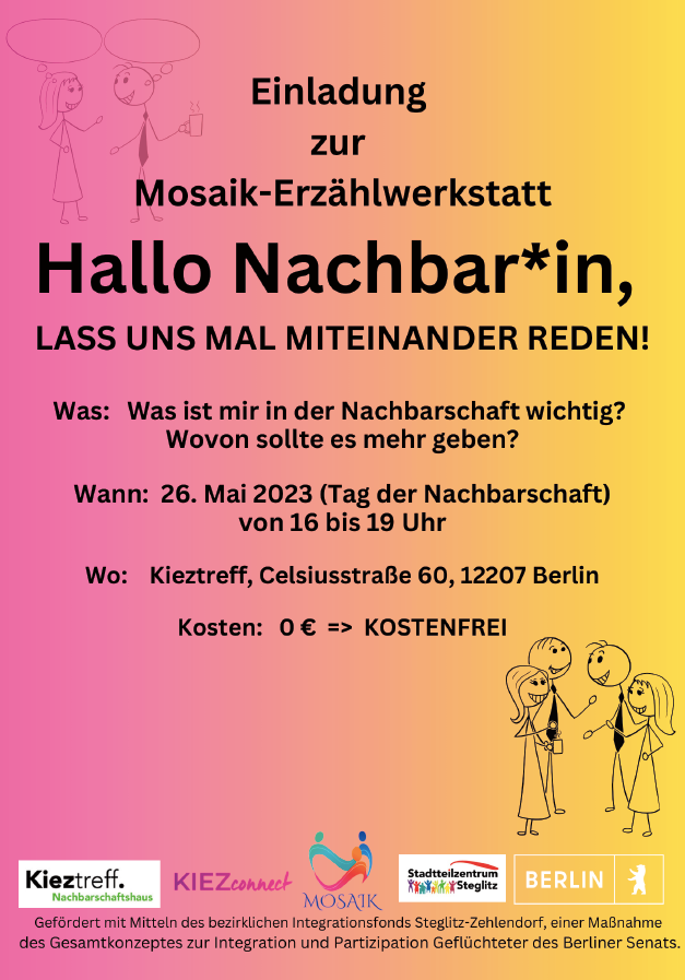 | 30/05/23، من الساعة 2 ظهرًا إلى الساعة 6 مساءً | ورشة اللقاء | مهرجان حي فينيكس لأسبوع الحي | Teltower-Damm 228, 14165 Berlin, Zehlendorf-Süd |