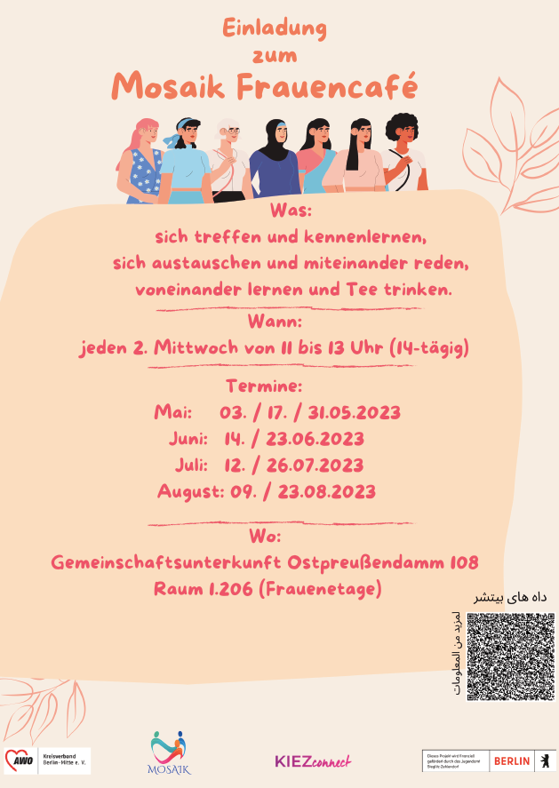 | 26.07.23، 18.30-20.30 | موكوكوسو | صيف فن وثقافة الفسيفساء: أمسية فارسية مع موسيقى ياسر بيات، قراءة، أشهى المأكولات | Wiese am Phoenix، Teltower Damm 228، 14165 برلين، زيهليندورف سود |