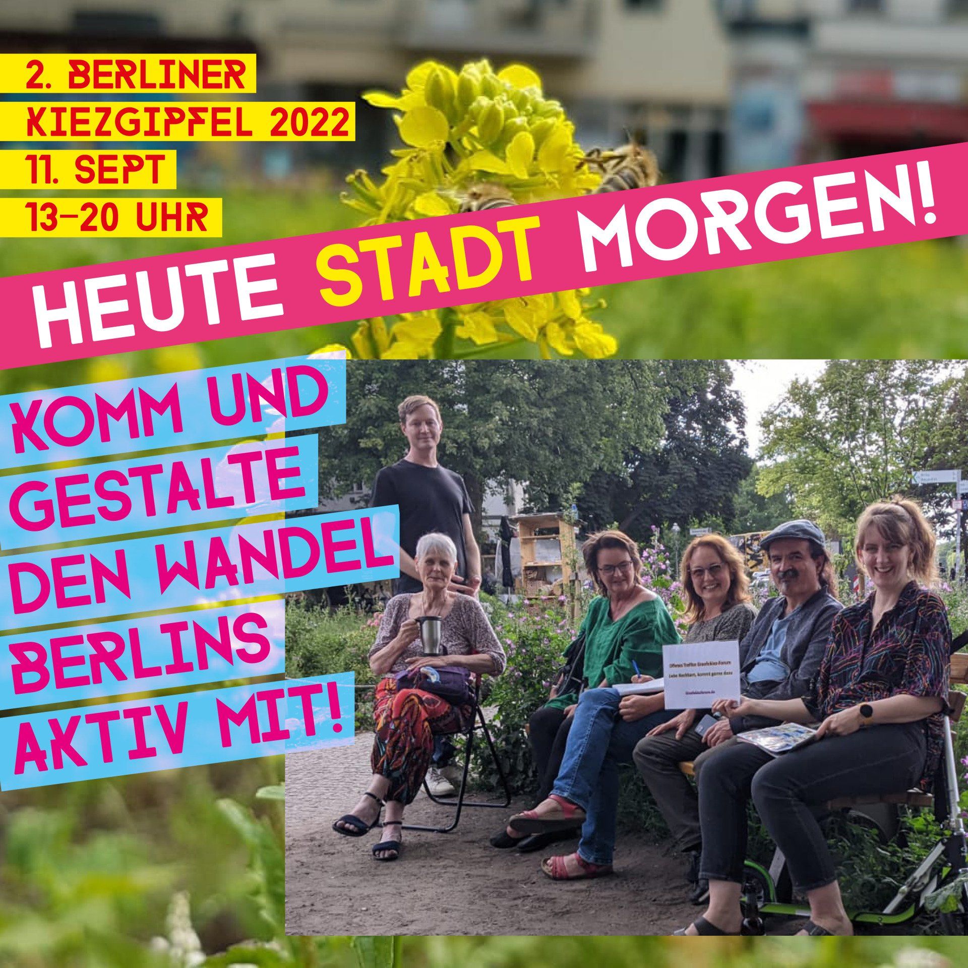 Participating in the neighborhood summit: Various neighborhood (block) and neighborhood initiatives, Changing Cities, Berlin21, climate restart, Extinction Rebellion, Litterpicker, Day of the Good Life, KIEZconnect, Fridays for Future, grandmas against the right, Yeşil Çember, Open Dreams Brandenburg eV, Transformation House & Field, Open Society Initiative, More Democracy eV, Circus Cabuwazi, Moos, bUm - Space for solidarity with each other, Urbanstraße neighborhood house, Omas for Future, Donut Berlin, PowerShift, Public Welfare Economy Berlin/Brandenburg; Architects for Future & Expedition Basic Income, Joliba eV, paper planes eV and other initiatives. As guests - Hansaforum Münster