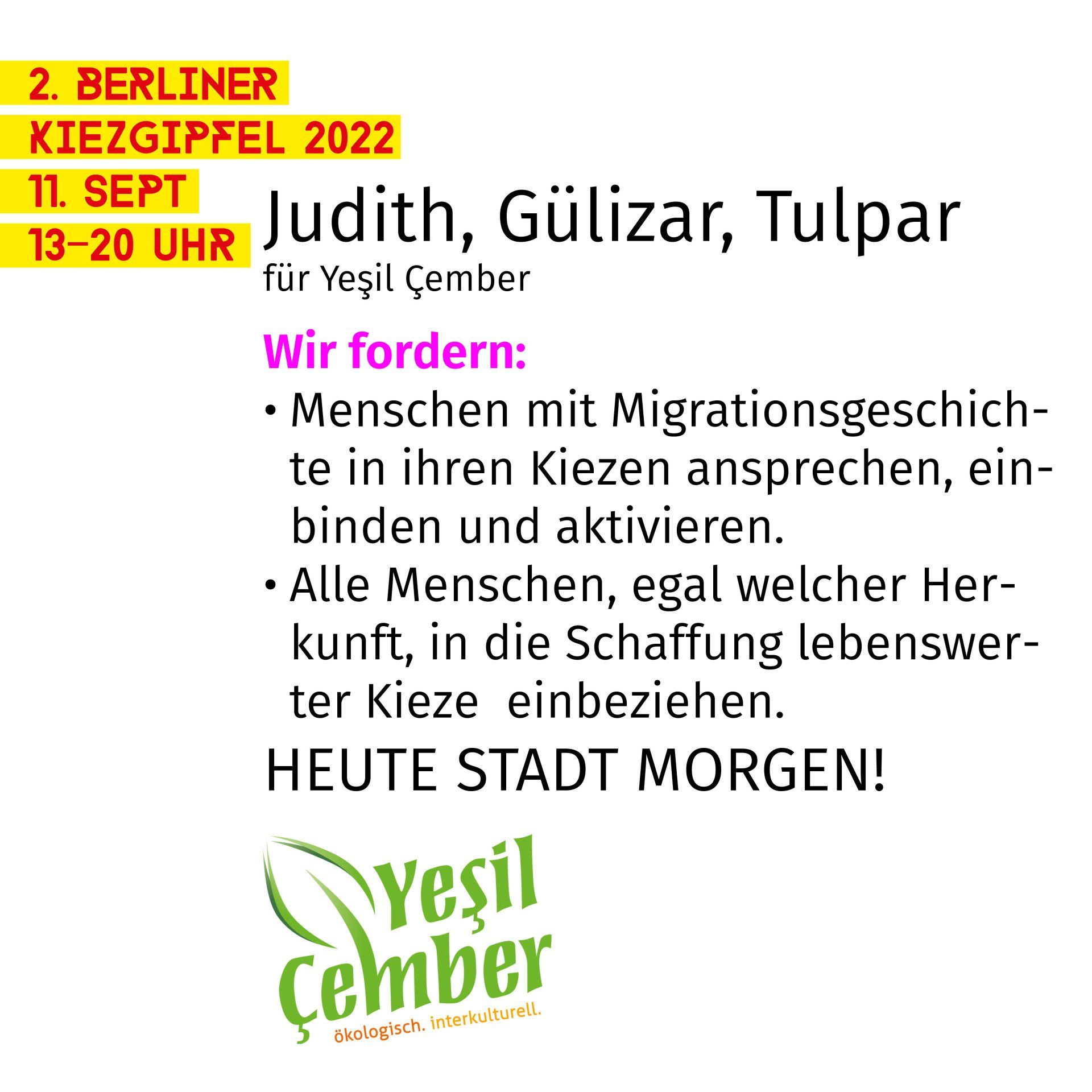 DEMAND THE KIEZGIPFEL INITIATIVES: One for all - all for one Berlin is colourful, lively and diverse and home to almost 4 million people from over 190 countries around the world. The great cultural diversity and the ability to constantly reinvent oneself are faced with huge problems: housing shortages, increasing traffic chaos, discrimination against minorities, loneliness ... In addition, heat records in summer are increasingly endangering health, water is becoming scarce - Berlin is hardly there yet prepared for the consequences of the climate crisis. A livable, just and solidary city can only come about if all its residents can actively and directly participate in its development. In our neighbourhoods, there is limited citizen participation and scope for urban design, where competence, creativity and commitment are brought in for the benefit of all, but others have an influence on the higher political decision-making levels: organized lobby groups, which only represent private interests - and the common good like to lose sight of. We want to counteract this imbalance! In order to master the opportunities and challenges of our city, more direct co-determination of movements, initiatives and individual citizens is needed. We need the hands and minds of all Berliners for our neighborhoods! Participation Now! we want to talk And want to act together! The needs of the people are still not sufficiently listened to by the politically responsible. The neighborhood initiatives are closer to the reality of life and can build bridges in administration and politics - for the benefit of all. But they have to be heard, taken seriously and encouraged! Participation and co-determination must not remain the privilege of a minority. That's why we're gathering today for the Berlin neighborhood summit. Many organizations come together and bring their demands with them. We are all united by the goal of climate-friendly urban development and a fairer urban society. For Berlin's future viability, it needs environmentally friendly mobility, climate-friendly construction, affordable housing, a fairer distribution of goods and a declaration of war against racism and discrimination. There are exciting solutions and many skills in the neighborhoods for all of these topics. We must seize this opportunity! We demand more transparency where economic interests and politics are too closely intertwined. We demand constant and direct forms of participation for the city dwellers: live on site in the neighborhoods in order to strengthen our democracy, enable participation and find viable solutions to the problems of our city. Our goal is cooperation between politics, administration and civil society on an equal footing so that Berlin can be a city for everyone.