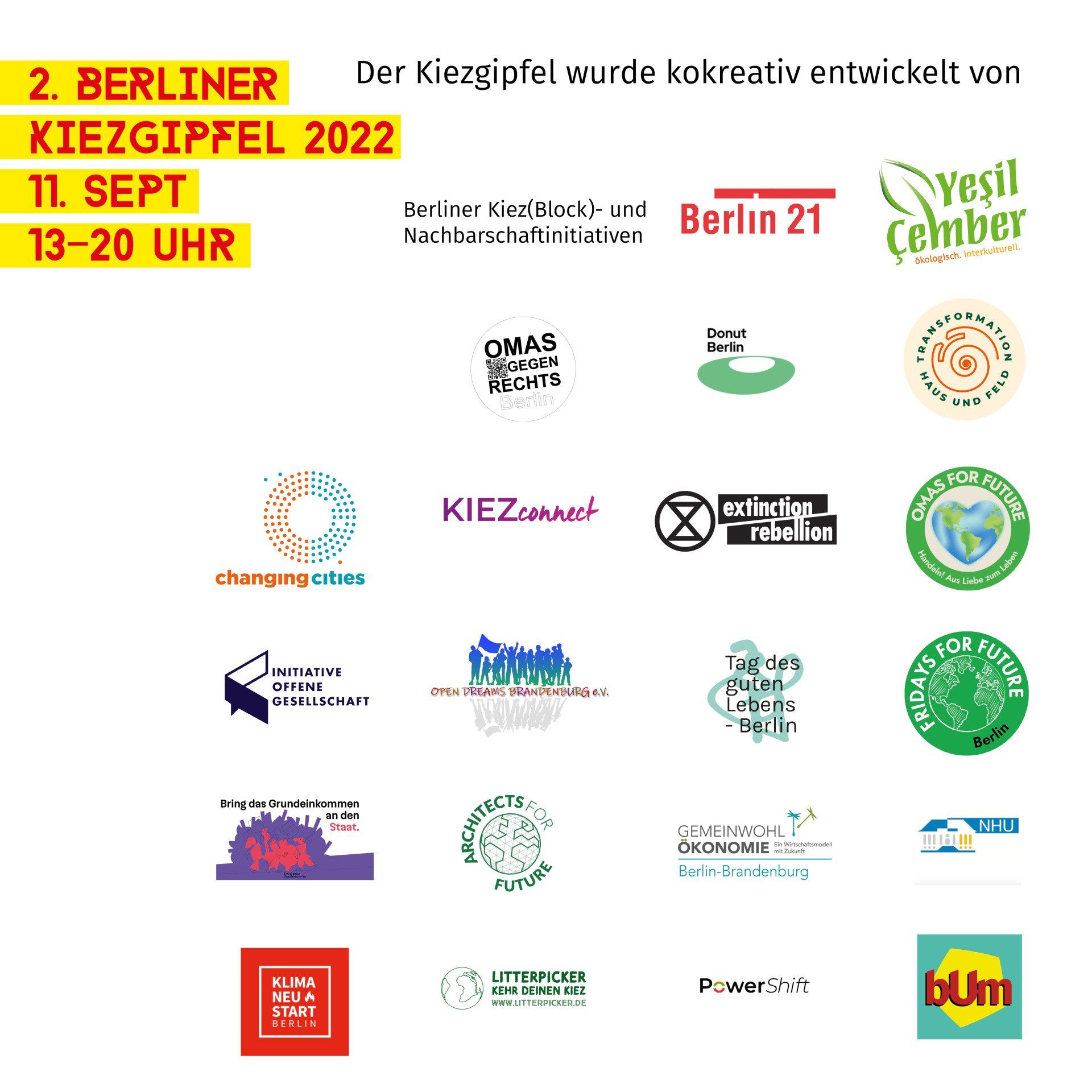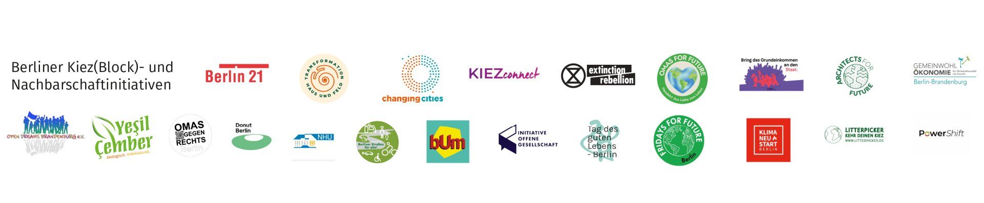 Participando en la cumbre vecinal: Varias iniciativas vecinales (manzana) y vecinales, Changing Cities, Berlin21, reinicio climático, Extinction Rebellion, Litterpicker, Día del Buen Vivir, KIEZconnect, Fridays for Future, abuelas contra la derecha, Yeşil Çember, Open Dreams Brandenburg eV, Transformation House & Field, Initiative Open Society, More Democracy eV, Circus Cabuwazi, Moos, bUm - Space for Solidarity Together, Neighborhood House Urbanstraße, Omas for Future, Donut Berlin, PowerShift, Public Welfare Economy Berlin/Brandenburg; Architects for Future & Expedition Basic Income, Joliba eV, paper planes eV y otras iniciativas. Como invitados - Hansaforum Münster