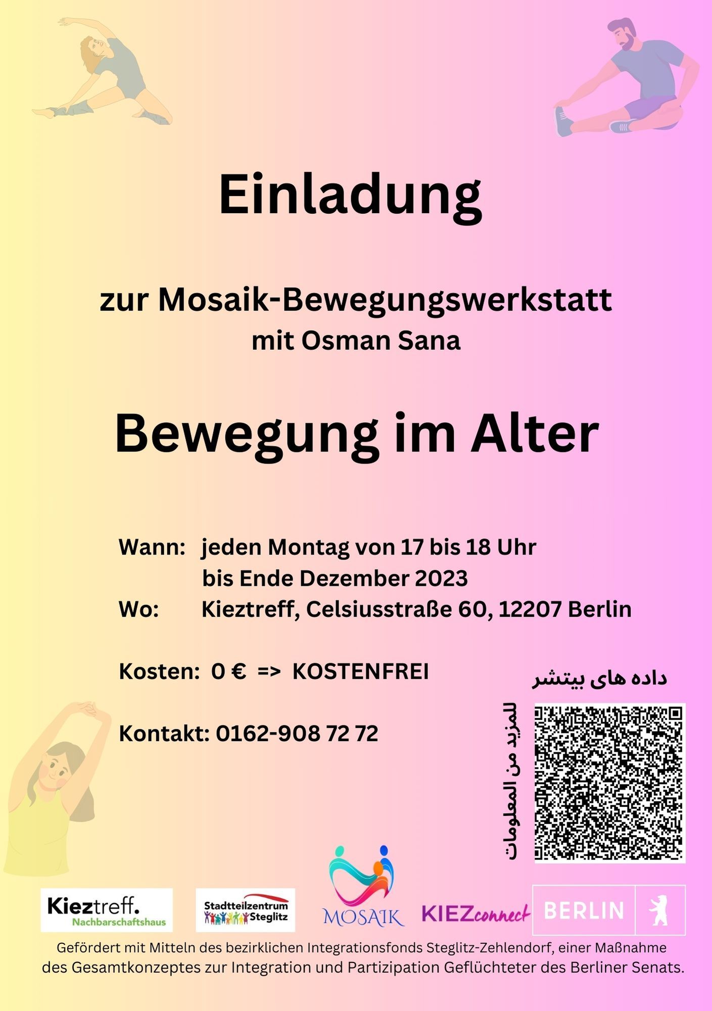 | دوشنبه ها، 5-6 بعد از ظهر | کارگاه جلسه | حرکت با عثمان | کیزترف، سلسیستر. 60، 12207 برلین، Lichterfelde-Süd |