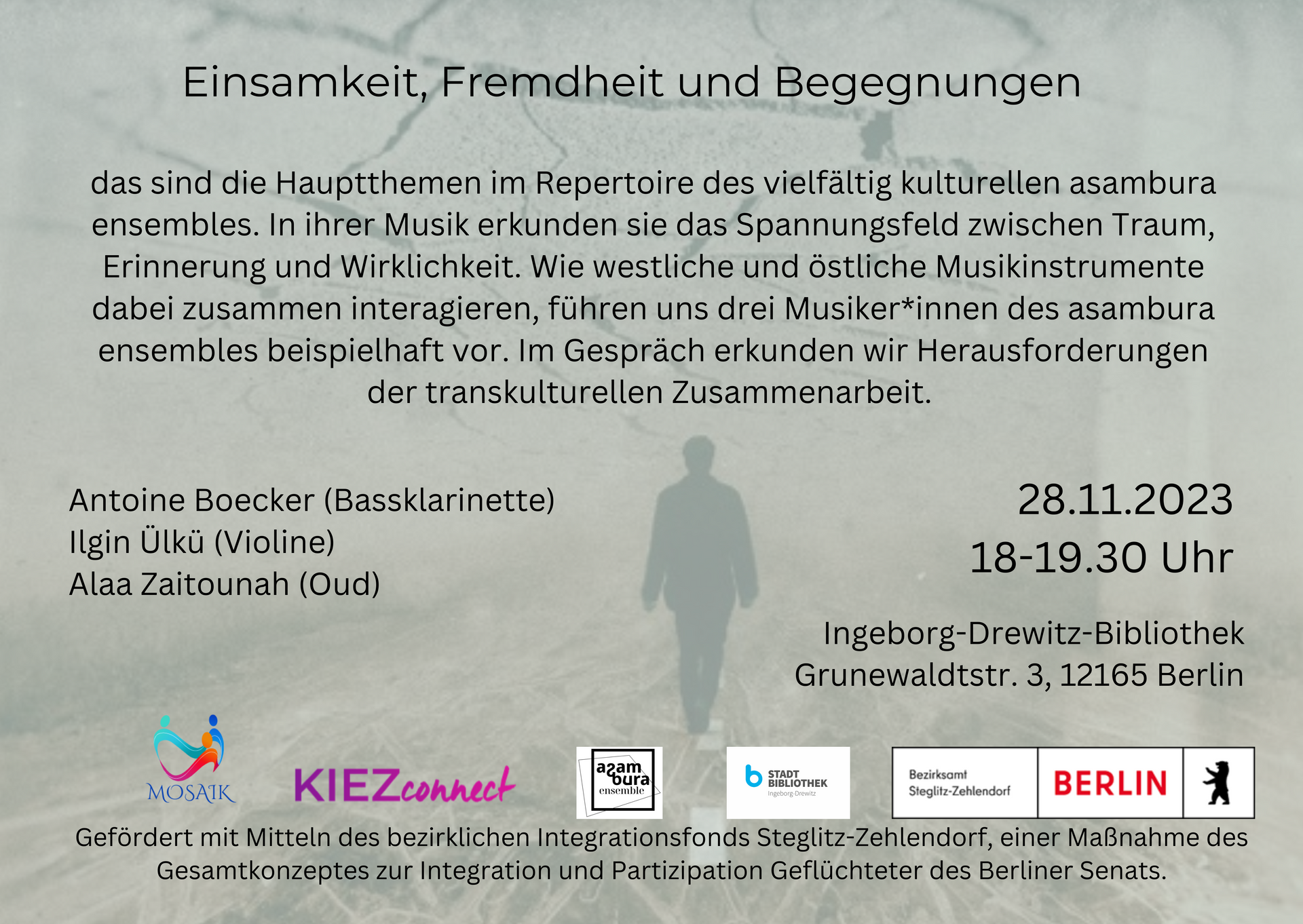 | 28 نوامبر 2023، 6-7:30 بعد از ظهر | کارگاه قصه گویی | موسیقی با Asambura | کتابخانه اینگبورگ درویتز، استگلیتز |