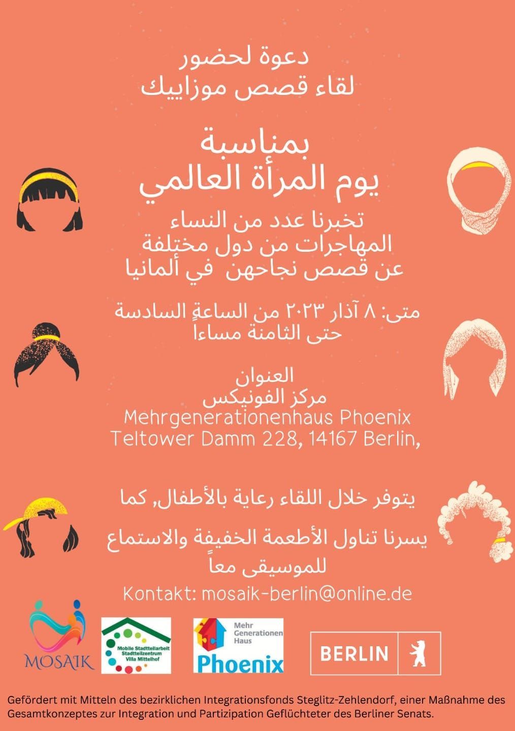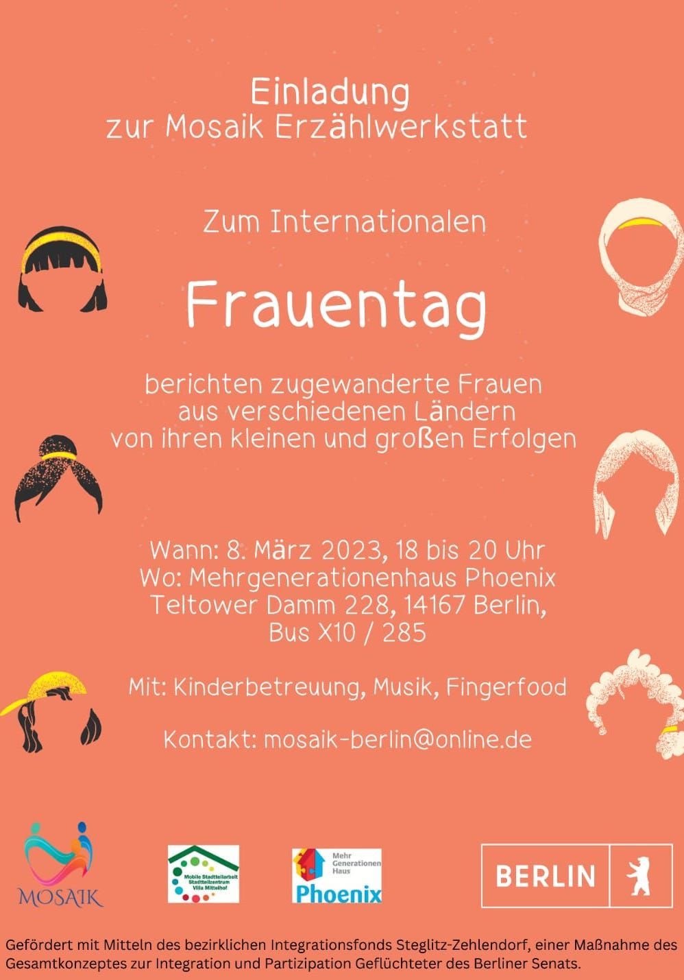 | 8 مارس 2023، 6 تا 8 بعد از ظهر | کارگاه قصه گویی | دور موزاییک زنان برای روز جهانی زن | Phönix, Teltower Damm 228, 14165 Berlin, Zehlendorf-Süd |