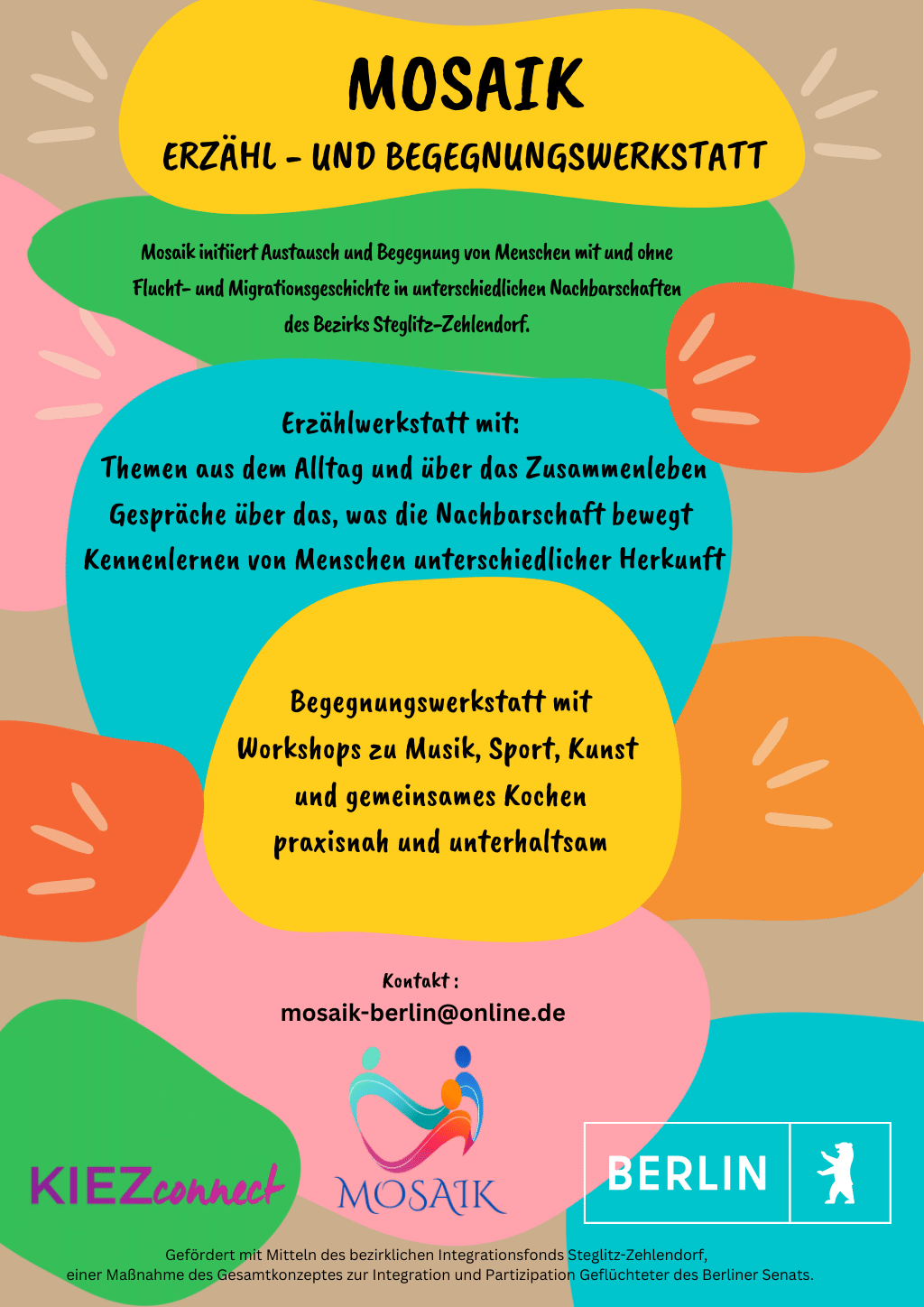 | هر سه شنبه اول، ساعت 6-7 بعد از ظهر | نشست موزاییک | تیم و بیشتر | کتابخانه اینگبورگ درویتز، استگلیتز |