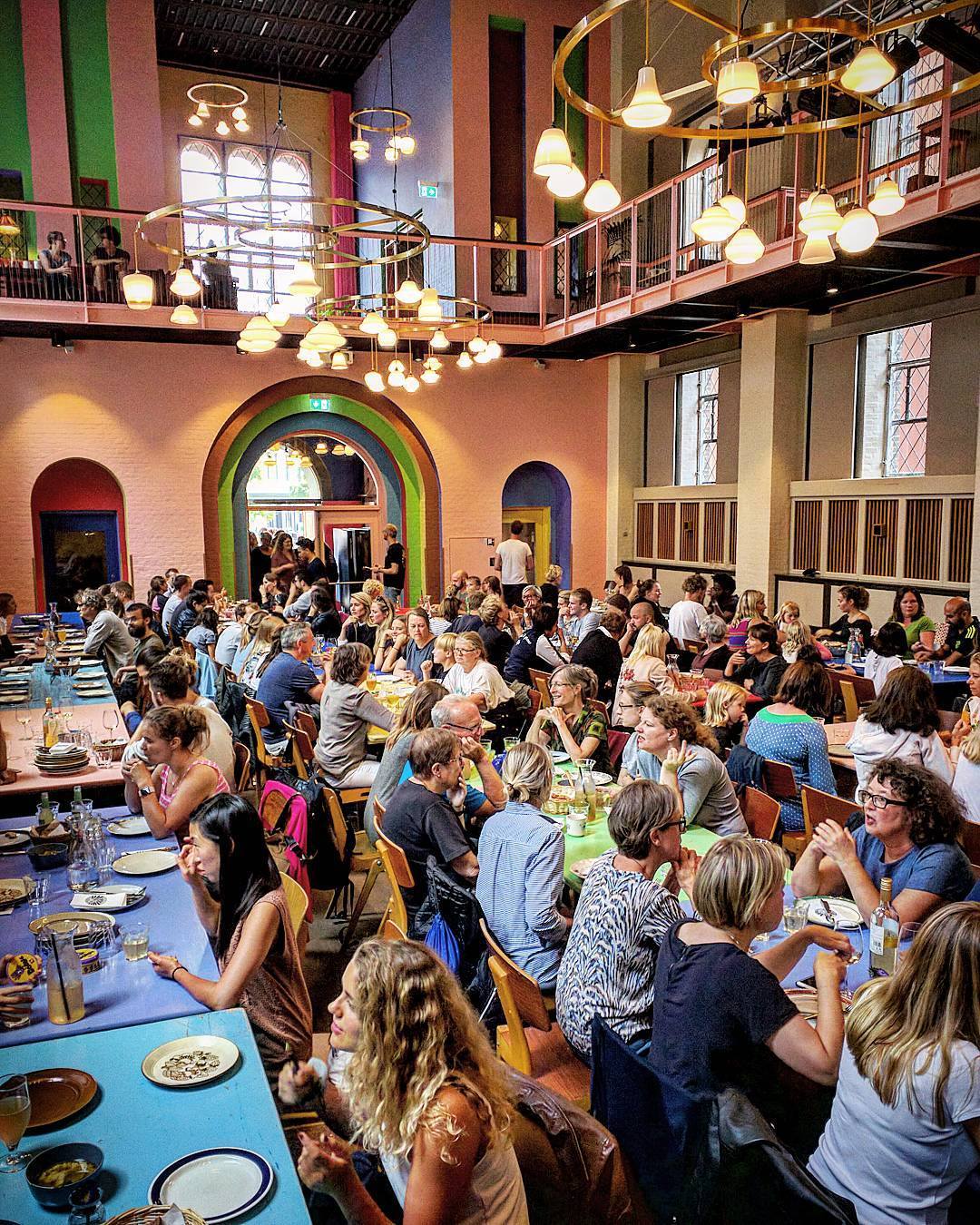 Kopenhag'daki Folkehuset Absalon'da topluluk yemekleri / Kulturmarkhalle'nin (Berlin, Pankow) önündeki terasta mahalle buluşması
